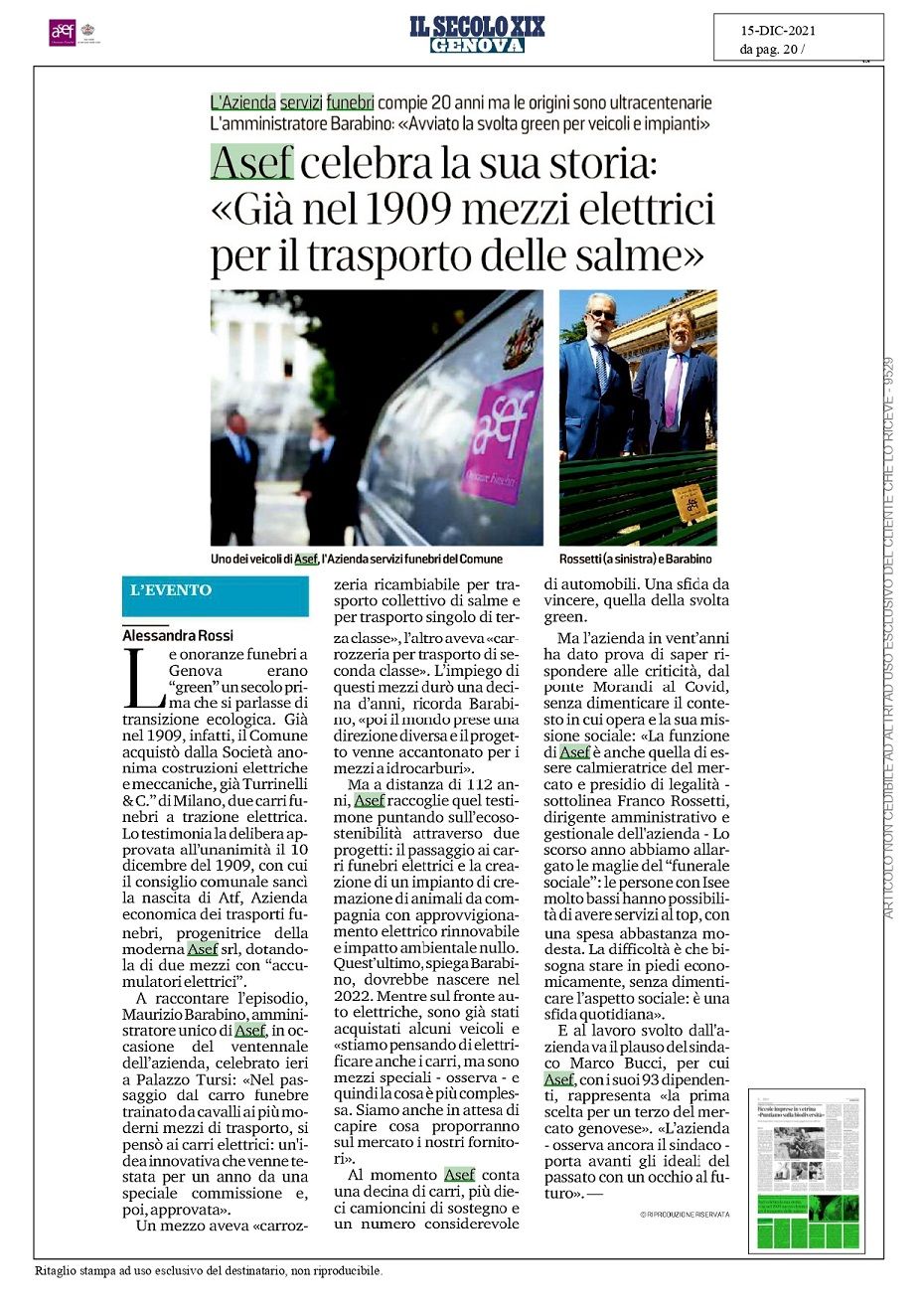 Modernità. Economicità. Qualità. Valore sociale. C’è un “fil rouge”, un tema che sottende 112 anni di vita delle onoranze e trasporti funebri del Comune di Genova, affonda le radici nella costituzione di ATF, l’Azienda economica di trasporti funebri della Città e attraversa il tempo, dal 1909 fino a giungere all’ultimo ventennio, in cui A.Se.F. ne ha ereditato i compiti, mantenendone inalterato il Dna. A.Se.F., l’Azienda dei servizi funebri del Comune di Genova, compie vent’anni. E al suo ventesimo compleanno, oggi come ieri, è un’azienda che svolge un compito sociale, nel senso più ampio del termine: così come fu ATF, è un’azienda moderna, amministrata in economicità, esprime servizi altamente qualitativi e, soprattutto, è vicina ai cittadini in un momento di grande prostrazione psicologica e fragilità, anche finanziaria perché costretti ad una spesa indifferibile.