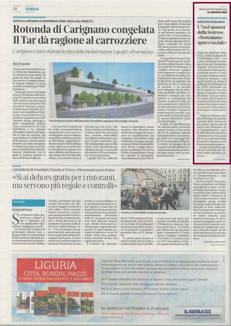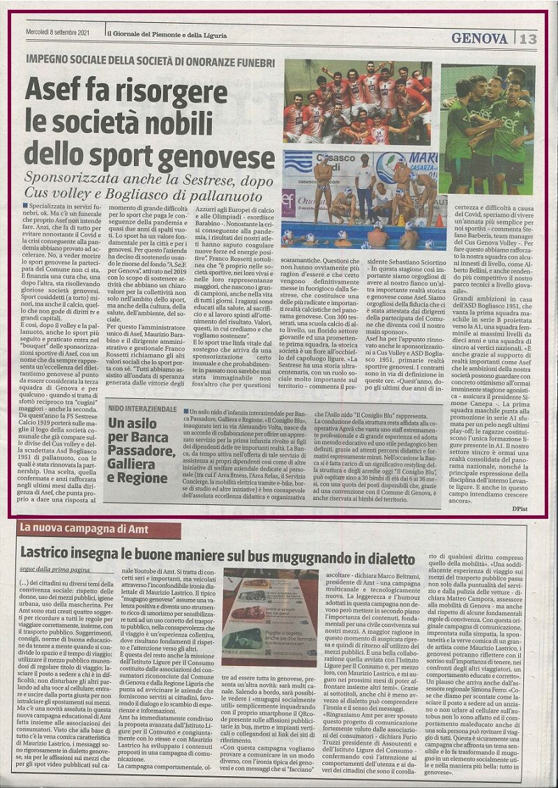 A.Se.F. ha deciso di sostenere la società calcistica della FS Sestrese Calcio 1919 e nel contempo, di rinnovare la partnership con CUS Genova Volley e ASD Bogliasco 1951. Tutto ciò in un momento di grande difficoltà per lo sport che paga le conseguenze della pandemia e quasi due anni di spalti vuoti.