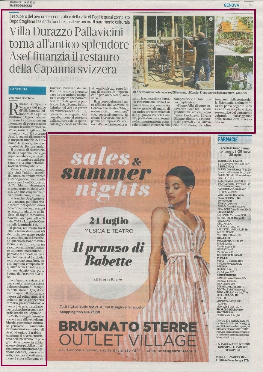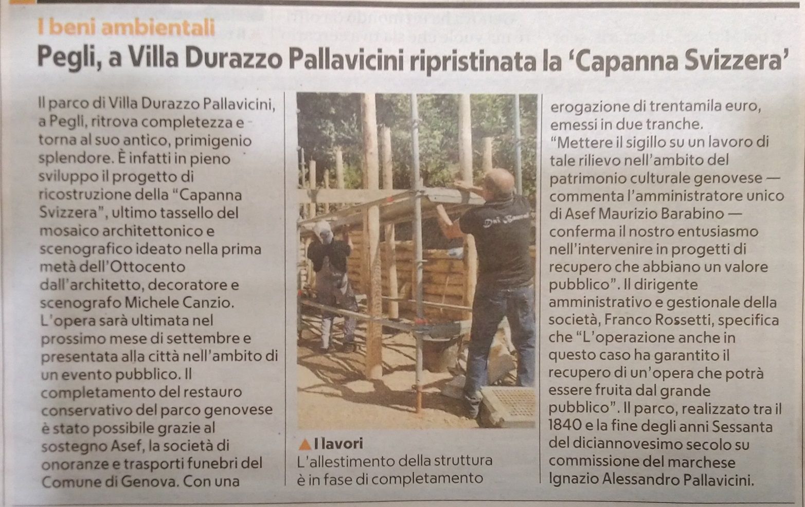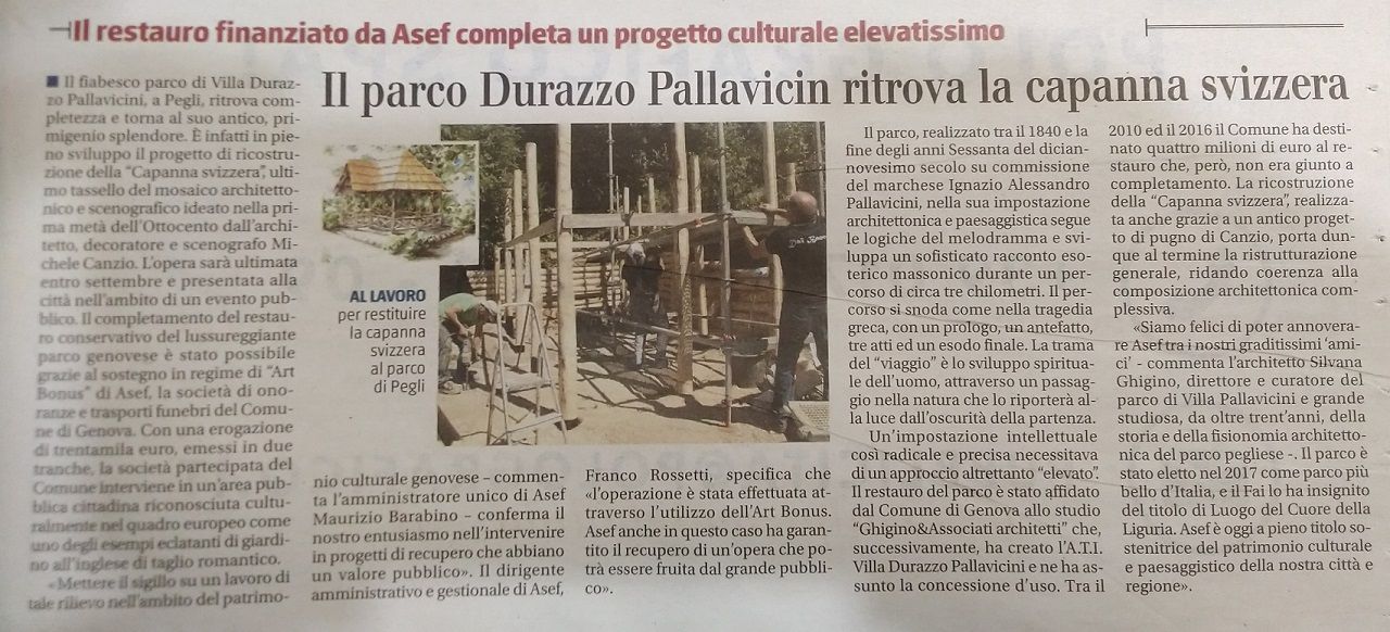 Il fiabesco parco di Villa Durazzo Pallavicini, a Pegli, ritrova completezza e torna al suo antico, primigenio splendore con il progetto di ricostruzione della “Capanna svizzera”, ultimo tassello del mosaico architettonico e scenografico ideato nella prima metà dell’Ottocento dall’architetto, decoratore e scenografo Michele Canzio. L’opera, ultimata e presentata alla città nell’ambito di un evento pubblico nel mese di settembre, completa il restauro conservativo del lussureggiante parco genovese grazie al sostegno in regime di “Art Bonus” di A.Se.F., la società di onoranze e trasporti funebri del Comune di Genova. Con una erogazione di trentamila euro, emessi in due tranche, la società partecipata del Comune interviene in un’area pubblica cittadina riconosciuta culturalmente nel quadro europeo come uno degli esempi eclatanti di giardino all’inglese di taglio romantico. “Mettere il sigillo su un lavoro di tale rilievo nell’ambito del patrimonio culturale genovese – commenta l’amministratore unico di A.Se.F. Maurizio Barabino – conferma il nostro entusiasmo nell’intervenire in progetti di recupero che abbiano un valore pubblico”. Il dirigente amministrativo e gestionale di A.Se.F. Franco Rossetti specifica che “L’operazione è stata effettuata attraverso l’utilizzo dell’Art Bonus. A.Se.F. anche in questo caso ha garantito il recupero di un’opera che potrà essere fruita dal grande pubblico”.