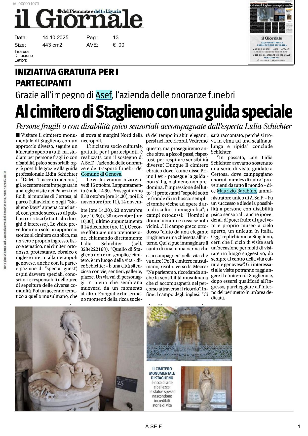 GENOVA, 13 OTTOBRE 2025 - Visitare il cimitero monumentale di Staglieno con un approccio diverso, seguire un itinerario aperto a tutti, ma studiato per persone fragili o con disabilità psico sensoriali: oggi è possibile grazie alla guida professionale Lidia Schichter di “Dalet – Tracce di memoria”, già recentemente impegnata in analoghe visite nei Palazzi dei Rolli, ai murales di Certosa, al parco Pallavicini e negli “Staglieno Days” appena conclusisi, con grande successo di pubblico e critica (e tanti altri luoghi d’interesse). Le visite prevedono non solo un approccio storico al cimitero cattolico, ma un vero e proprio ingresso, fisico e tematico, nei cimiteri ortodosso, protestante, ebraico e inglese interni alla necropoli genovese, anche con la partecipazione di “special guest”, ospiti davvero speciali, conoscitori e responsabili delle aree di sepoltura delle diverse comunità. Poi un accenno tematico a quello musulmano, che si trova ai margini Nord della necropoli.