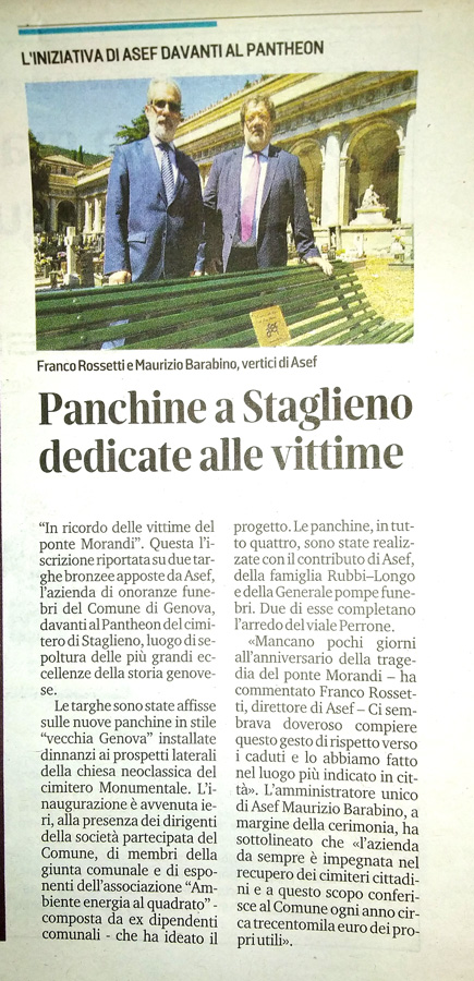 “In ricordo delle vittime del ponte Morandi”. Questa l’iscrizione riportata su due targhe bronzee apposte da A.SeF., presso il Pantheon del cimitero di Staglieno, luogo di sepoltura delle più grandi eccellenze della storia genovese. Le targhe sono state affisse sulle nuove panchine in stile “vecchia Genova” installate dinnanzi ai prospetti laterali della chiesa neoclassica del cimitero Monumentale. L’inaugurazione è avvenuta il 06 Agosto 2020, alla presenza dei dirigenti della società partecipata del Comune, di membri della giunta comunale e di esponenti dell’associazione “Ambiente energia al quadrato” - composta da ex dipendenti comunali - che ha ideato il progetto. Le panchine, in tutto quattro, sono state realizzate con il contributo di A.Se.F., della famiglia Rubbi - Longo e de “La Generale pompe funebri”. Due di esse completano l’arredo del viale Perrone.
