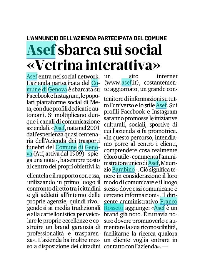 «Entrare nei social non è più una scelta, ma un dovere nei confronti dei cittadini – commenta l’amministratore unico di A.Se.F. Maurizio Barabino - In questo percorso, intendiamo porre al centro i clienti, comprendere cosa realmente è loro utile. Ciò significa tenere in considerazione il loro modo di comunicare e il luogo stesso dove essi comunicano e cercano informazioni. Per questo intendiamo moltiplicare le loro possibilità di entrare in contatto con l’azienda, con il suo brand e con le persone che ne costituiscono la fibra e l’ossatura». In linea con Maurizio Barabino, il dirigente amministrativo e gestionale di A.Se.F. Franco Rossetti sottolinea: «“Asef del Comune di Genova” è un brand già noto a Genova – dice - È tuttavia nostro dovere promuoverlo e aumentare la sua riconoscibilità, facilitarne la ricerca qualora un cliente voglia entrare in contatto con l’azienda. Entrando nei social, entriamo in un ambiente dove è più semplice e immediato condividere contenuti di valore sulle molte attività aziendali, sociali, culturali, sportive che essa svolge». Rossetti conclude assicurando che «È per noi indispensabile costruire e cementare un rapporto di fiducia con i cittadini, riversando lo stile Asef anche nei social network».