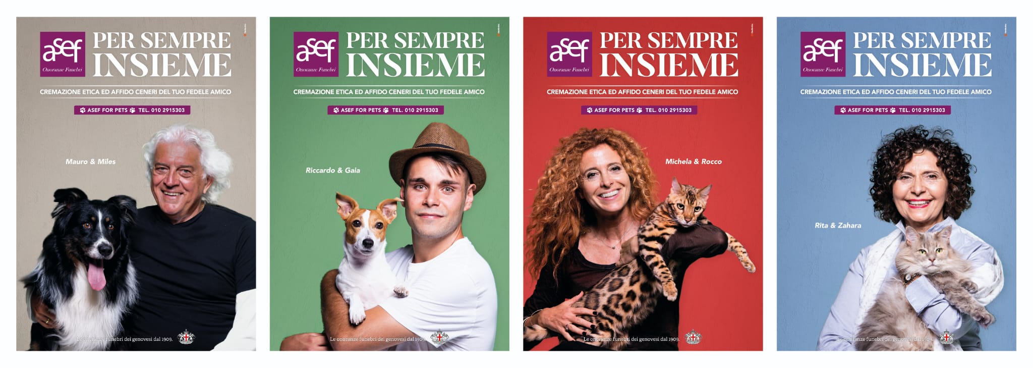 I testimonials della campagna sono quattro cittadini genovesi che hanno prestato i loro volti, insieme ai propri fedeli amici animali, all’iniziativa, facendosi portavoce del suo messaggio etico. Si tratta di Michela Porcile, 53 anni, avvocato penalista, con il suo gatto Rocco, 2 anni; Rita Deplano, 67 anni, specialista in pet therapy, con la sua gatta Zahara, 8 anni; Riccardo Lo Grasso, 23 anni, artigiano, con la sua cagnolina Gaia, 7 anni; Mauro Poggi, 66 anni, con il cane Miles, 5 anni.