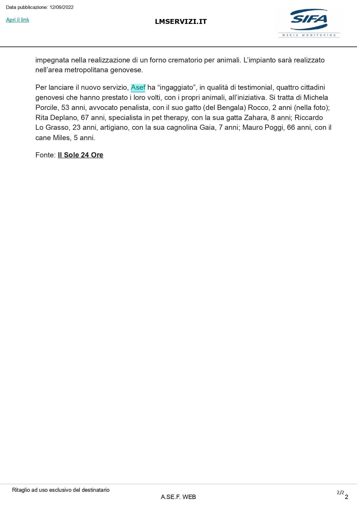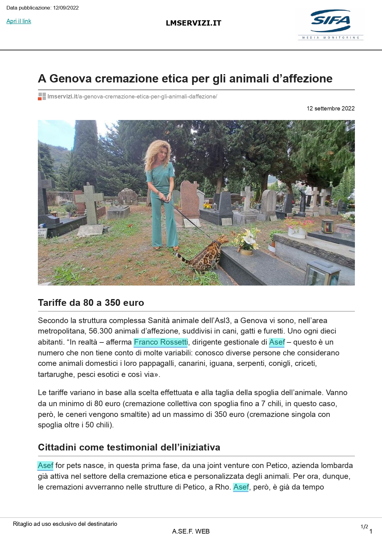 GENOVA – 12 settembre 2022 - Una campagna pubblicitaria capillare in ambito cittadino appoggerà e presenterà ai genovesi la nascita di “A.Se.F. for Pets”, la nuova divisione della società pubblico partecipata del Comune di Genova specializzata in onoranze e trasporti funebri. Le affissioni e la cartellonistica partiranno il 20 settembre.