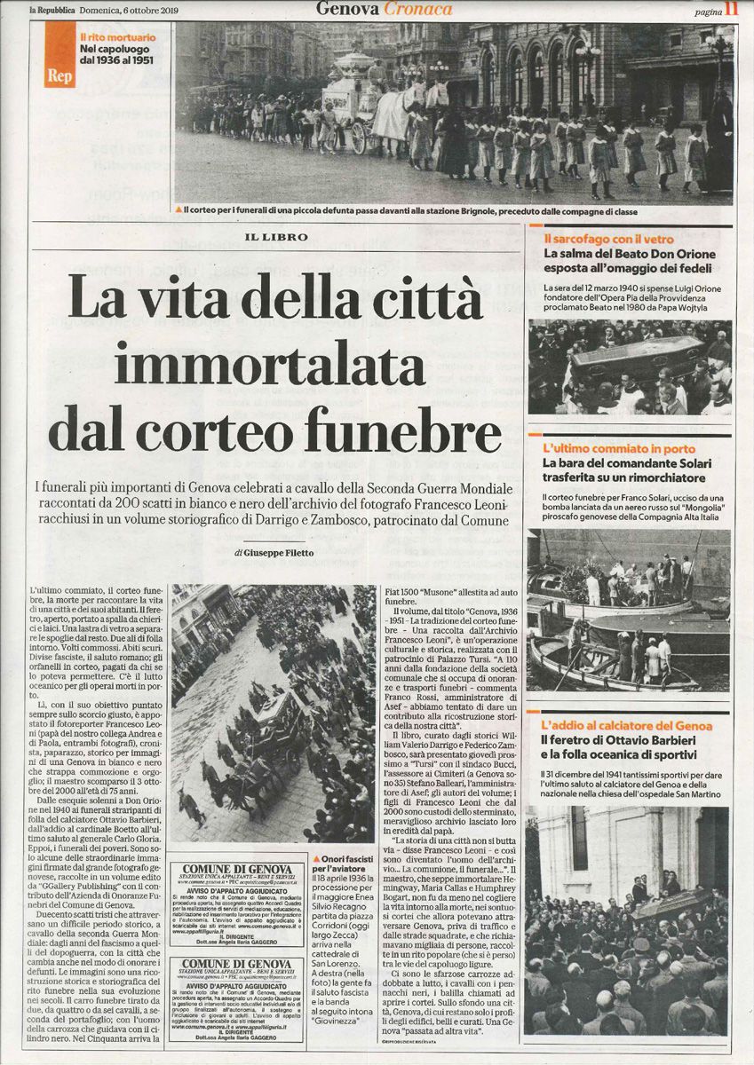 Quindici anni di scatti, dal 1936 al 1951, poco meno di duecento fotografie, per raccontare la tradizione del corteo funebre, così come era grandiosamente interpretato a Genova, a cavallo della Seconda Guerra Mondiale: uno spaccato della società e dei quartieri, a volte difficili da riconoscere.