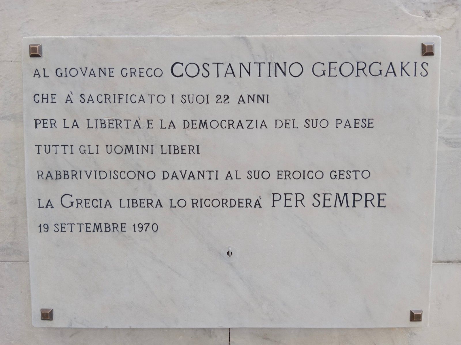 Kostas Georgakis, 23 anni, studente di Geologia a Genova, compì il più estremo dei gesti: si cosparse di benzina e si diede fuoco, trovando la morte. Lo fece in piazza Matteotti, all’alba del 19 settembre 1970.