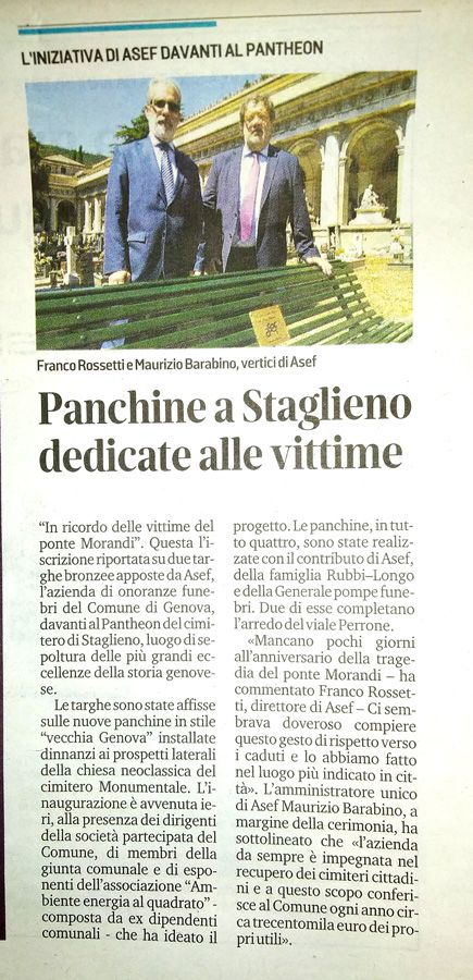 “In ricordo delle vittime del ponte Morandi”. Questa l’iscrizione riportata su due targhe bronzee apposte da A.SeF., presso il Pantheon del cimitero di Staglieno, luogo di sepoltura delle più grandi eccellenze della storia genovese. Le targhe sono state affisse sulle nuove panchine in stile “vecchia Genova” installate dinnanzi ai prospetti laterali della chiesa neoclassica del cimitero Monumentale. L’inaugurazione è avvenuta il 06 Agosto 2020, alla presenza dei dirigenti della società partecipata del Comune, di membri della giunta comunale e di esponenti dell’associazione “Ambiente energia al quadrato” - composta da ex dipendenti comunali - che ha ideato il progetto. Le panchine, in tutto quattro, sono state realizzate con il contributo di A.Se.F., della famiglia Rubbi - Longo e de “La Generale pompe funebri”. Due di esse completano l’arredo del viale Perrone.